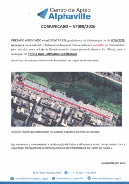 COMUNICADO SOBRE TROCA DE LÂMPADAS DO EDIFICIO GARAGEM 6 de abril de 2026 - Centro de Apoio Alphaville